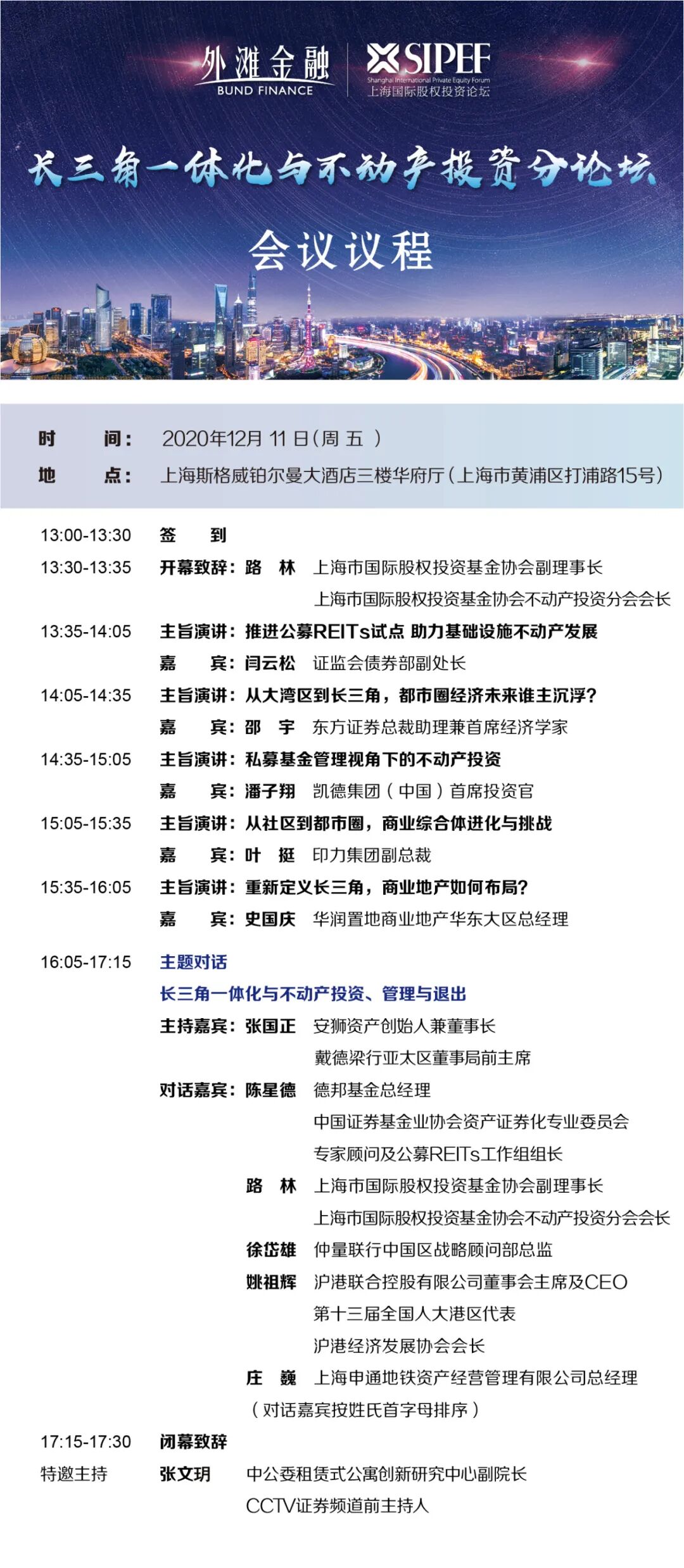 在此背景下,由上海市国际股权投资基金协会、上海市黄浦区金融服务办公室、中欧陆家嘴国际金融研究院共同举办,上海市国际股权投资基金协会不动产投资分会承办的“2020外滩金融·上海国际股权投资论坛不动产投资分论坛”将于2020年12月11日(周五)下午在上海举行。本届分论坛将围绕“长三角一体化与不动产投资”的主题,对不动产投资的现状及未来进行深入探讨。分论坛规模约150人,采用定向邀请方式,有意参会者请将“姓名+联系方式+邮箱+公司+职位”发送至协会秘书处指定邮箱(shenrui@shpea.com),符合参会条件者秘书处会在5个工作日内回复报名链接及邀请码,敬请留意。
