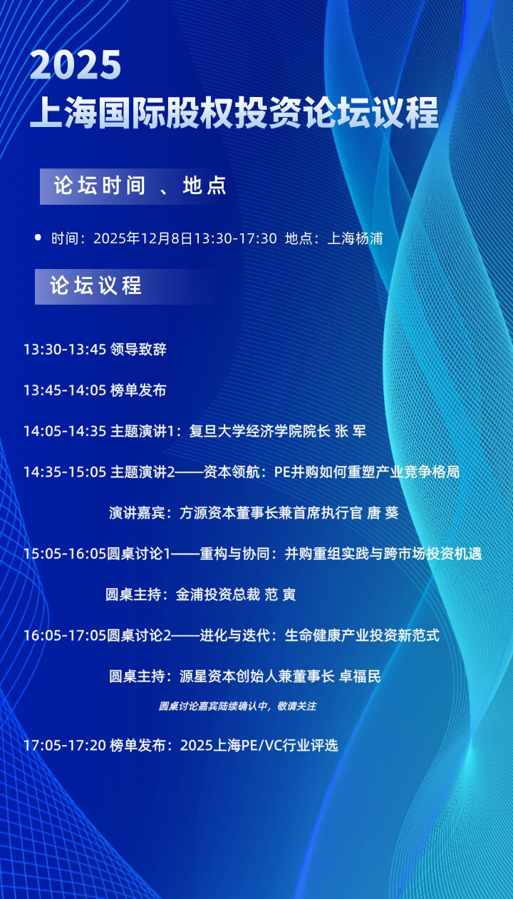 第十八届“上海国际股权投资论坛”(2025SIPEF) 将于2025年12月8日(周一)在杨浦举行。