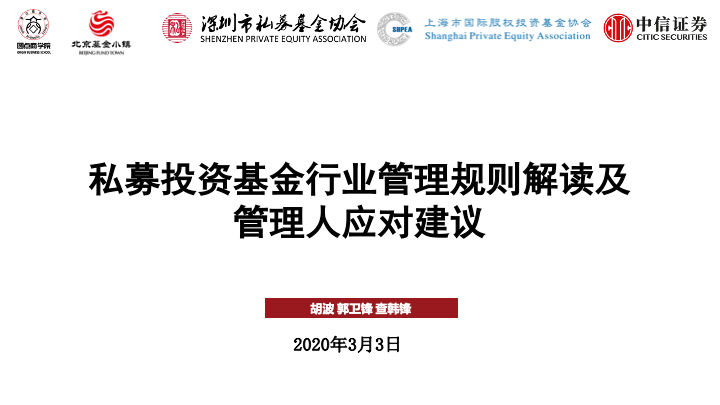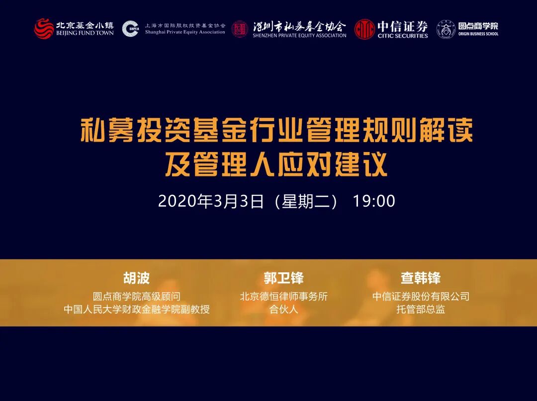 2020年3月3日,上海市国际股权投资基金协会、圆点商学院、北京基金小镇、深圳市私募基金协会、中信证券托管部,邀请圆点商学院高级顾问、中国人民大学财政金融学院副教授胡波,北京德恒律师事务所合伙人郭卫锋、中信证券托管部总监查韩锋以线上直播形式就此主题进行分享。嘉宾分享结束,大家也就实务中遇到的问题进行了交流,以下为直播过程中部分提问及解答。阅读全文获取回放课程!