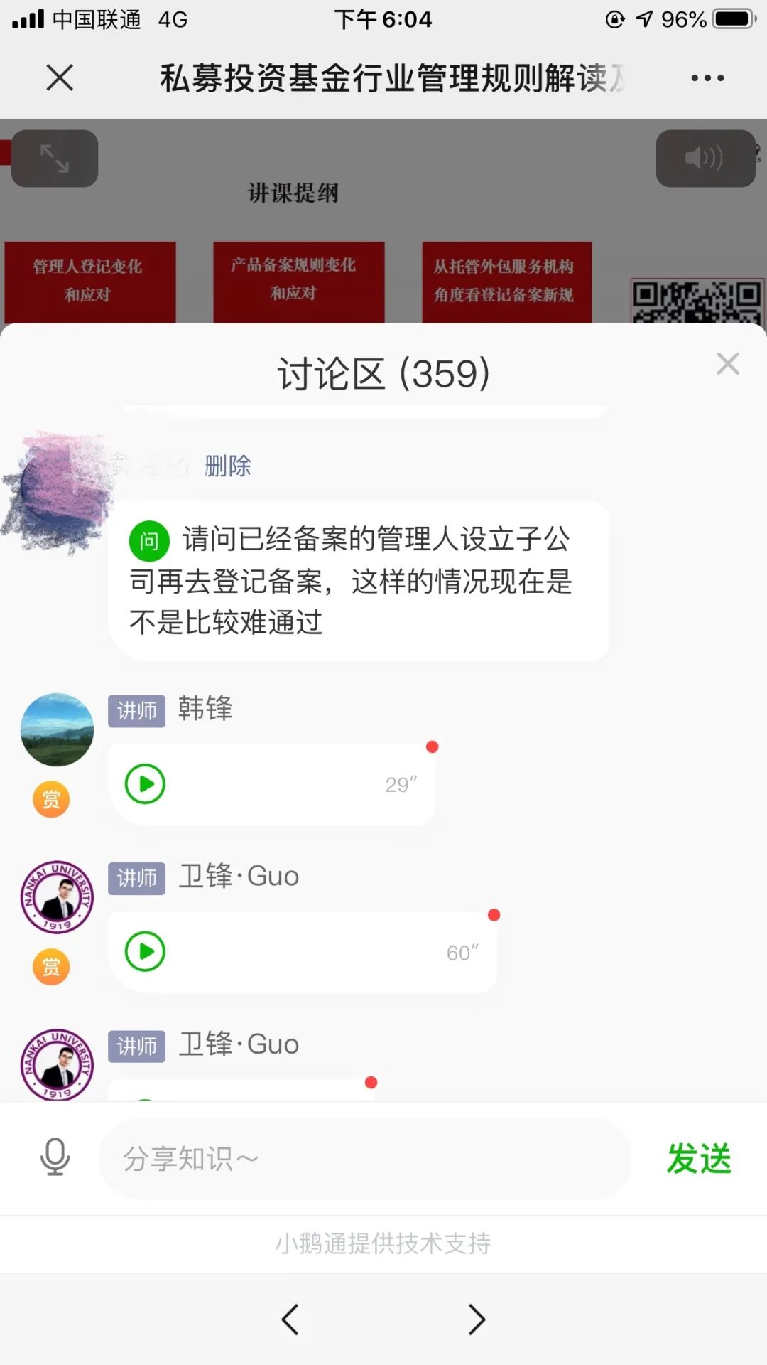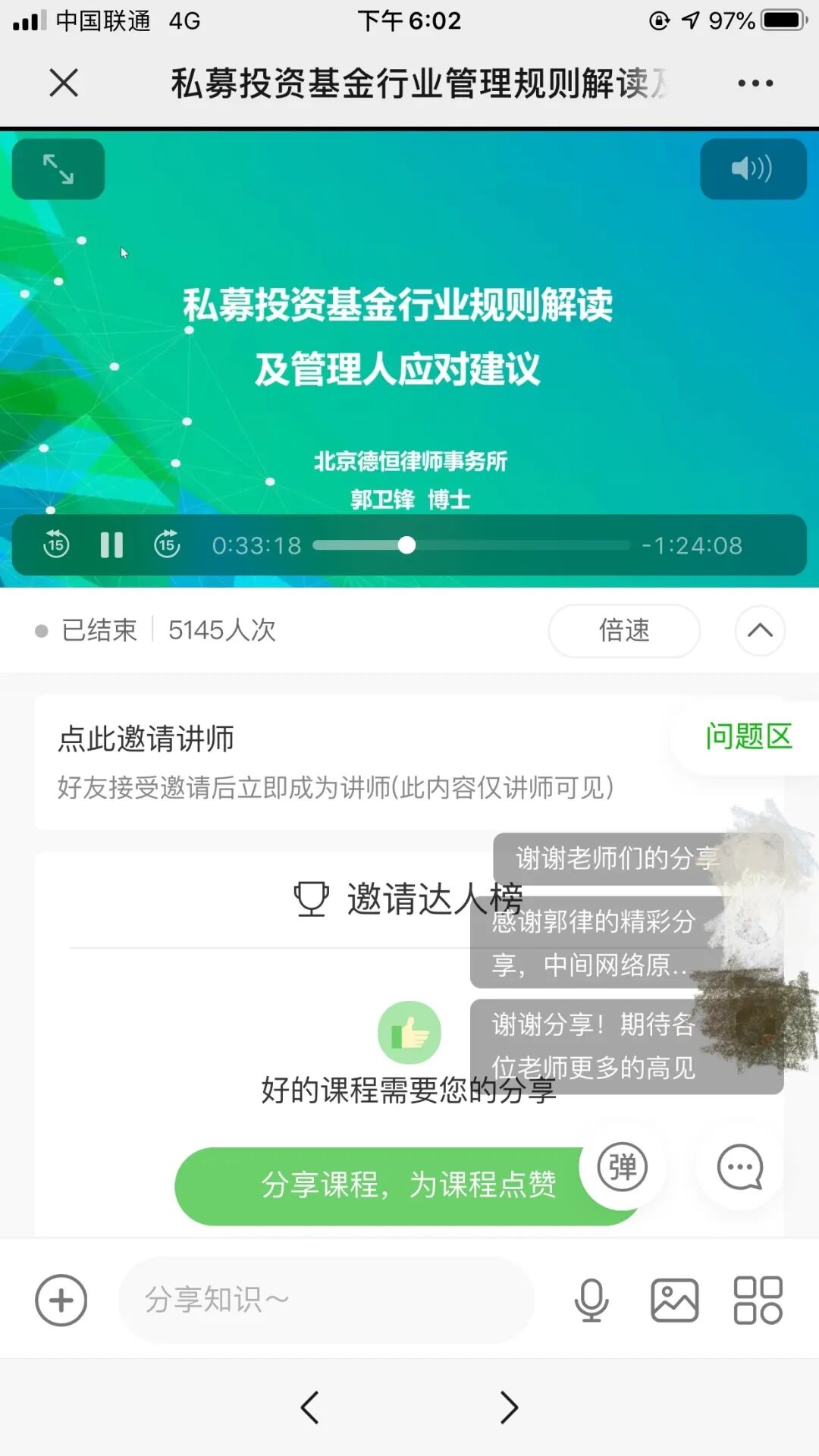答:大家在实务中还有想要交流的问题可以联系我们本次活动的主办单位:圆点商学院、北京基金小镇、上海市国际股权投资基金协会、深圳市私募基金协会、中信证券托管部,本次课程的内容我们也将同步给各个合作单位供大家后期学习,也可以联系圆点君(微信号ydsxy2018)。