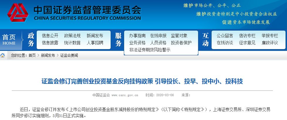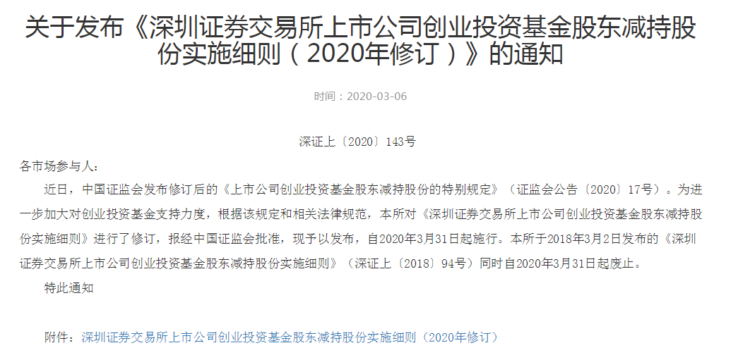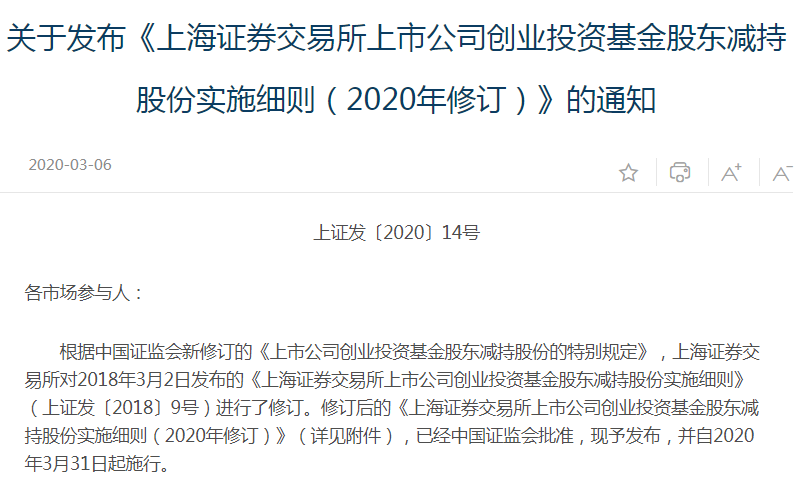 3月6日,上交所、深交所分别发布《上海证券交易所上市公司创业投资基金股东减持股份实施细则(2020年修订)》和《深圳证券交易所上市公司创业投资基金股东减持股份实施细则(2020年修订)》