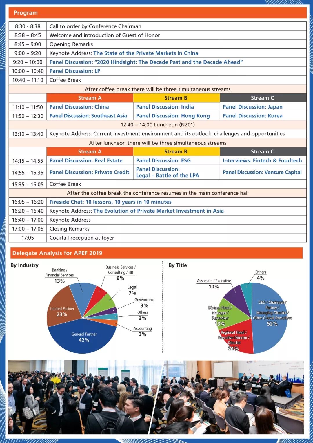亚洲私募股权投资论坛(APEF)是一个具有区域性和全球性的行业盛会,每年由香港创业与私募投资协会(HKVCA)组织,目前论坛是亚洲历史最悠久且最具规模的行业性论坛。APEF2020将在香港政府年度国际金融周期间举行。